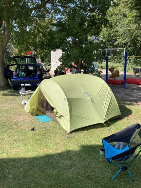 Hellgrünes Wanderzelt in der Bildmitte auf einer kurzgeschnittenen Rasenfläche. Links davon, unter einem großen Baum, ein kleines blaues Auto mit offener Heckklappe. Im Vordergrund ein kleiner Campingstuhl. Im Hintergrund ein Spielplatz mit Spielgeräten, dahinter Bäume.