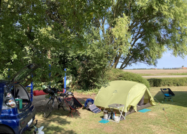 Hellgrünes Zelt umgeben von Hocker, Tischchen, Auto, Fahrrad und Bäumen. Das Zelt steht in der Sonne, das Auto im Schatten. Im Hintergrund ist ein Acker zu sehen und ein wenig blauer Himmel darüber.