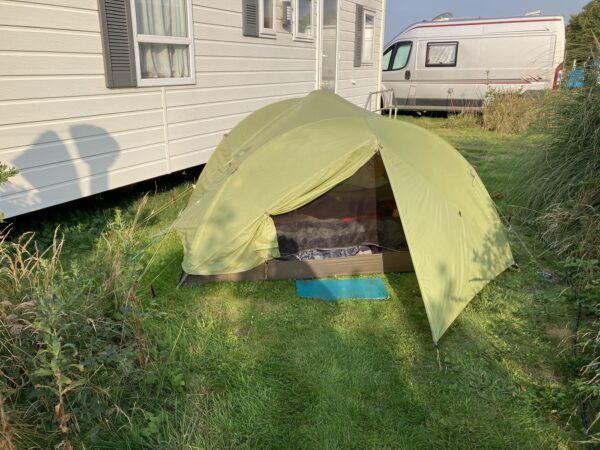 Hellgrünes, sonnenbeschienenes Wanderzelt neben weißem Campinghaus, im Hintergrund steht ein Wohnmobil.