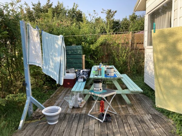 Hölzerne Tisch-Bank-Garnitur in Helltürkis auf Holzboden, im Vordergrund Wäscheleine mit Tüchern. Auf dem Tisch, daneben und darunter stehen Küchensachen.